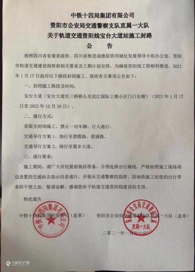 关于轨道交通资阳线宝台大道站施工封路的公告