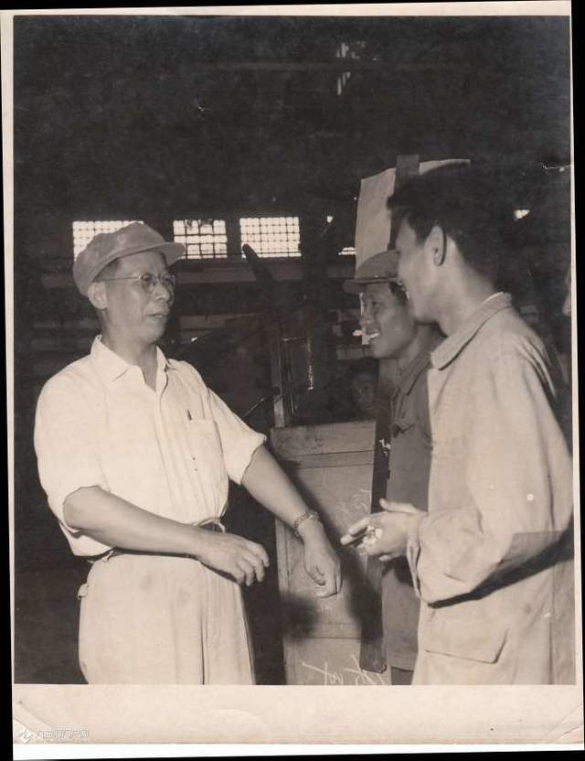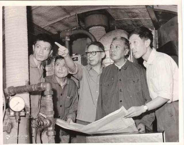 (下图为唐茂松在车间资阳内燃机车厂柴油机分厂组装试验车间现场,陪同老红军、党委副书记向守富指导工作。)