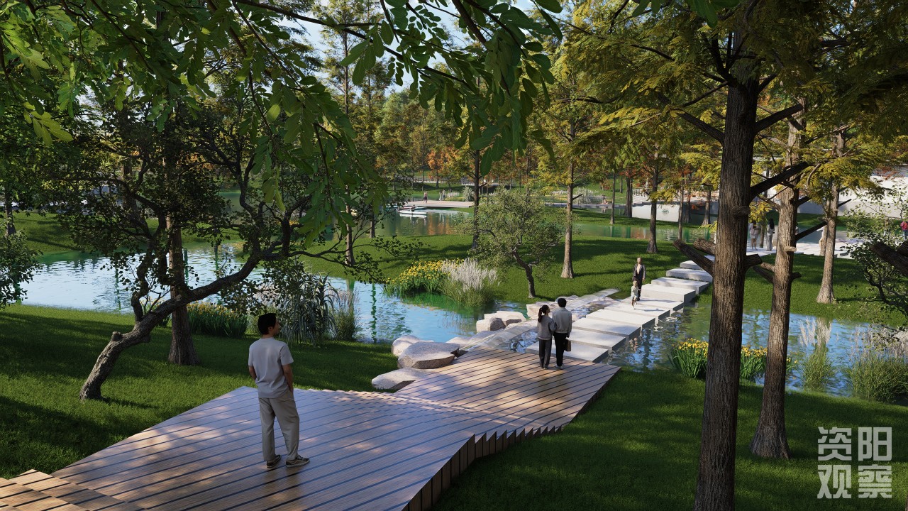 在水资源利用与景观营造上,公园设计亮点十足。3.8公里蜿蜒的核心水域与1.5公里生态水岸形成“活水回归”系统,让水流保持灵动活力;起伏地形勾勒出“山丘之畔、碧泽浅丘”的自然景致,使公园与周边环境无缝融合。更值得期待的是,有高差的补水口不仅能以潺潺水流增添野趣,还可实现水体曝氧,助力生态循环持续焕发生机。