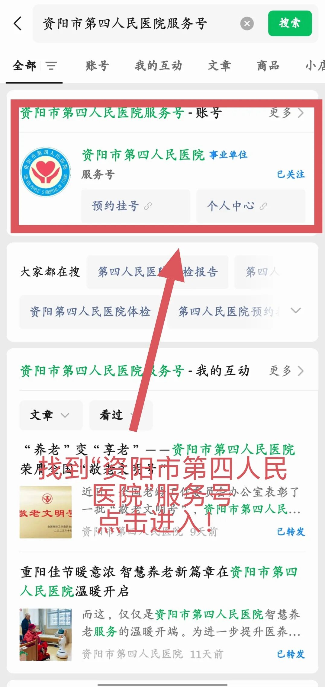 第一步:在微信搜索栏目,找到“资阳市第四人民医院”服务号,点击进入。
