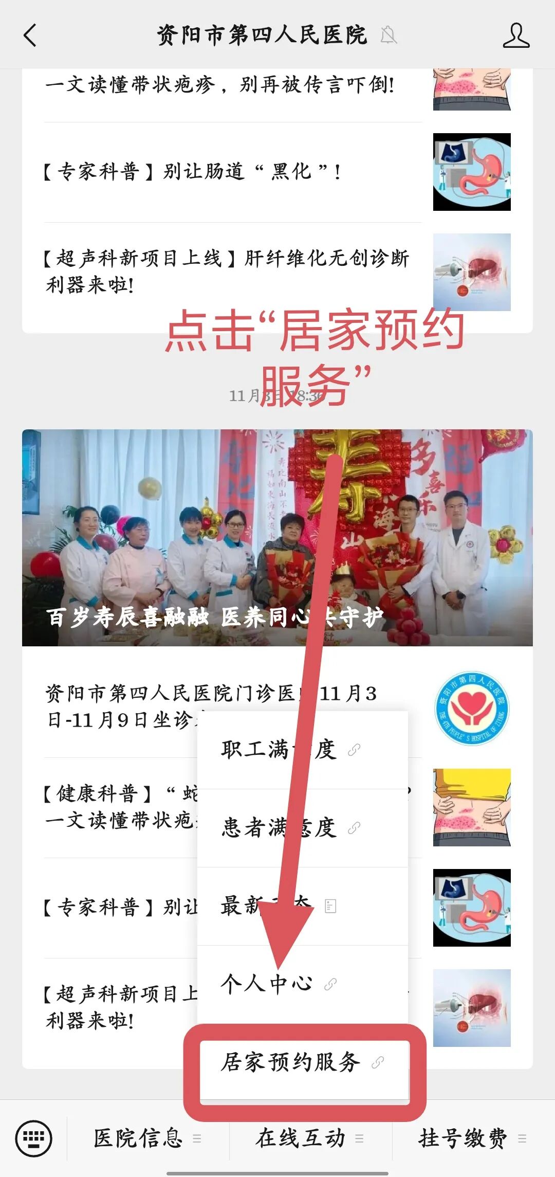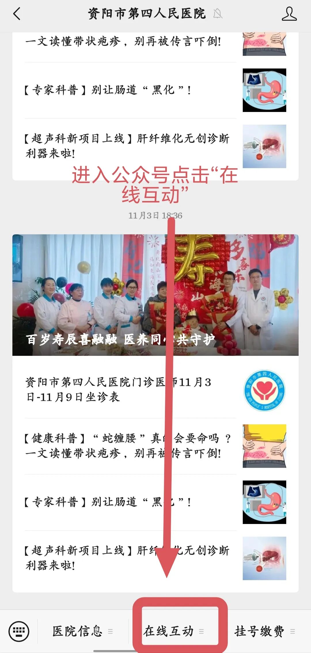 第二步:进入资阳市第四人民医院服务号,点击下方“在线互动”。
