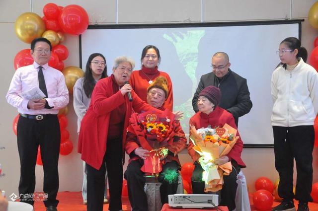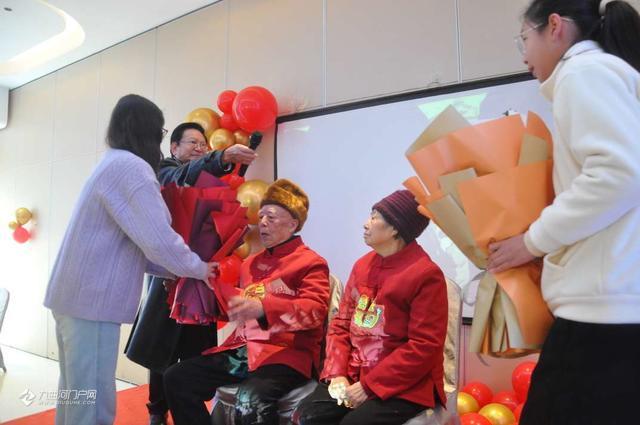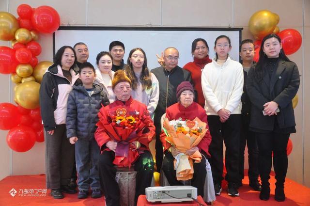 庆典仪式上,寿星俩孙女代表晚辈向寿星及其夫人敬献鲜花,全体家人上台合影留念,定格幸福瞬间。