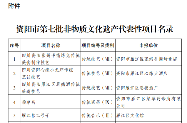 12月9日,资阳市人民政府公布了第七批非物质文化遗产代表性项目名录,我区5项入选,涵盖传统技艺、传统医药、传统音乐三大类别,分别是四川资阳张妈手撕烤兔传统美食制作技艺、四川资阳心缘小龙虾传统烹饪技艺、四川资阳雁江区恩德酒传统酿造技艺、梁草药、雁江抬工号子。