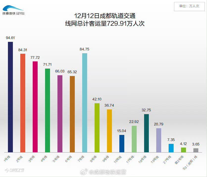 12月12日成都轨道交通线网总计客运量729.91万人次。