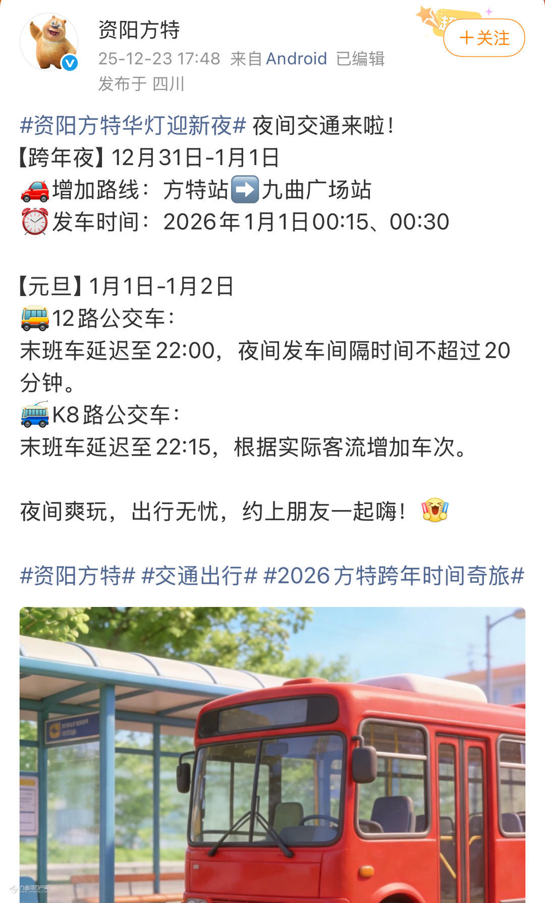 新增路线 + 末班车延时,资阳跨年夜和元旦公交有调整!