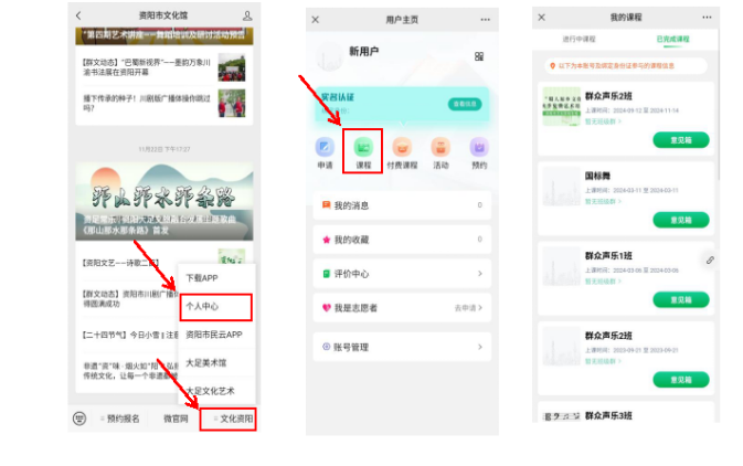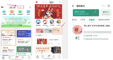 (一)手机APP报名方式1.下载并登录文化馆软件APP“文化天府”。2.右上角切换至资阳市。3.浏览页面课程介绍。4.点击“课程报名”,选择对应课程输入信息报名即可。