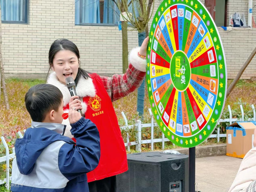 “塑料瓶是什么垃圾?”“我知道!是可回收物!”在校园一侧,一个色彩缤纷的垃圾分类大转盘前排起了长队。转盘上标注着各种常见垃圾类型,孩子们通过投掷飞镖选择题目,并大声回答对应的分类。每当飞镖命中、答案正确,现场便响起阵阵欢呼。这种将知识与游戏相结合的方式,迅速激发了小学生的参与兴趣,许多孩子反复排队体验,在欢笑中轻松掌握了分类知识。