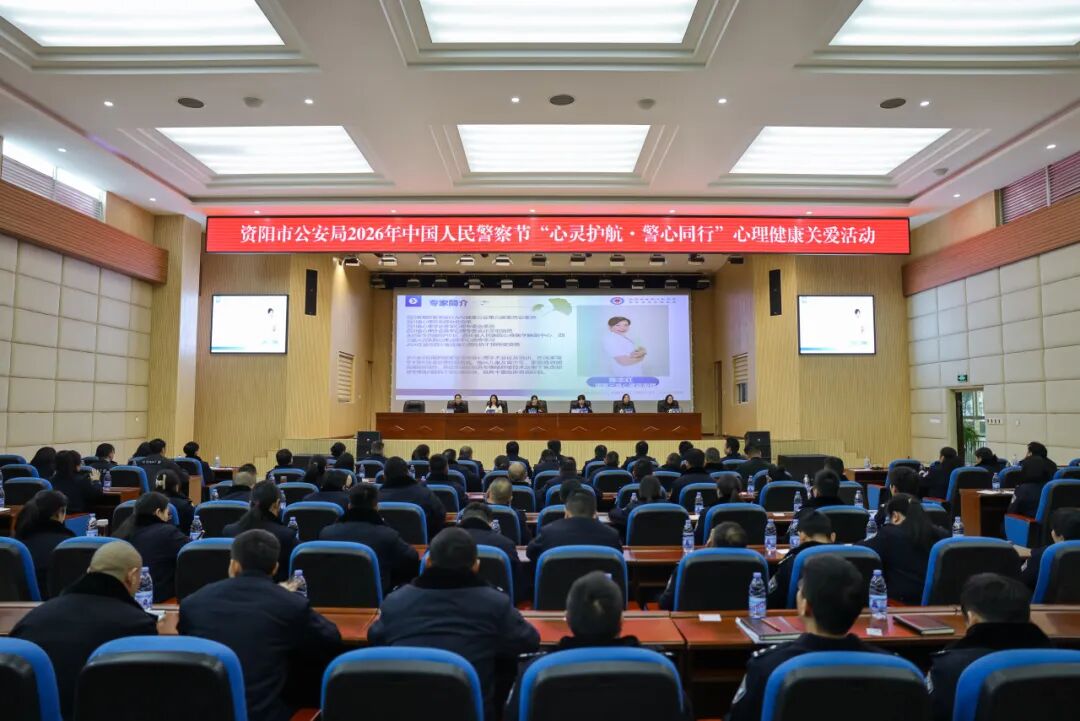 为深入贯彻落实从优待警各项举措,切实缓解民辅警在长期高强度执法执勤中积累的心理压力,提升心理调适能力与职业幸福感,在2026年中国人民警察节来临之际,资阳市公安局于1月7日下午,组织开展“心灵护航·警心同行”民辅警心理健康关爱活动。活动特邀资阳市第四人民医院心理健康专家团队走进警营,通过“专题讲座+团体辅导”相结合的方式,为百余名一线民辅警送上一场温暖而实用的“心灵减压课”。