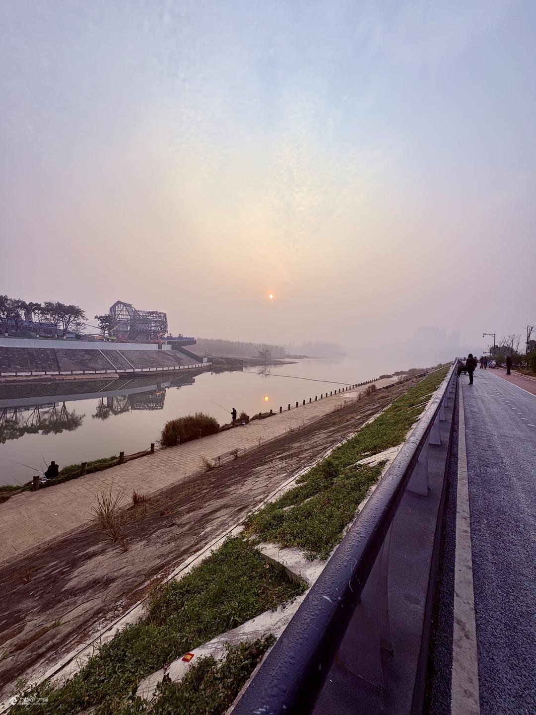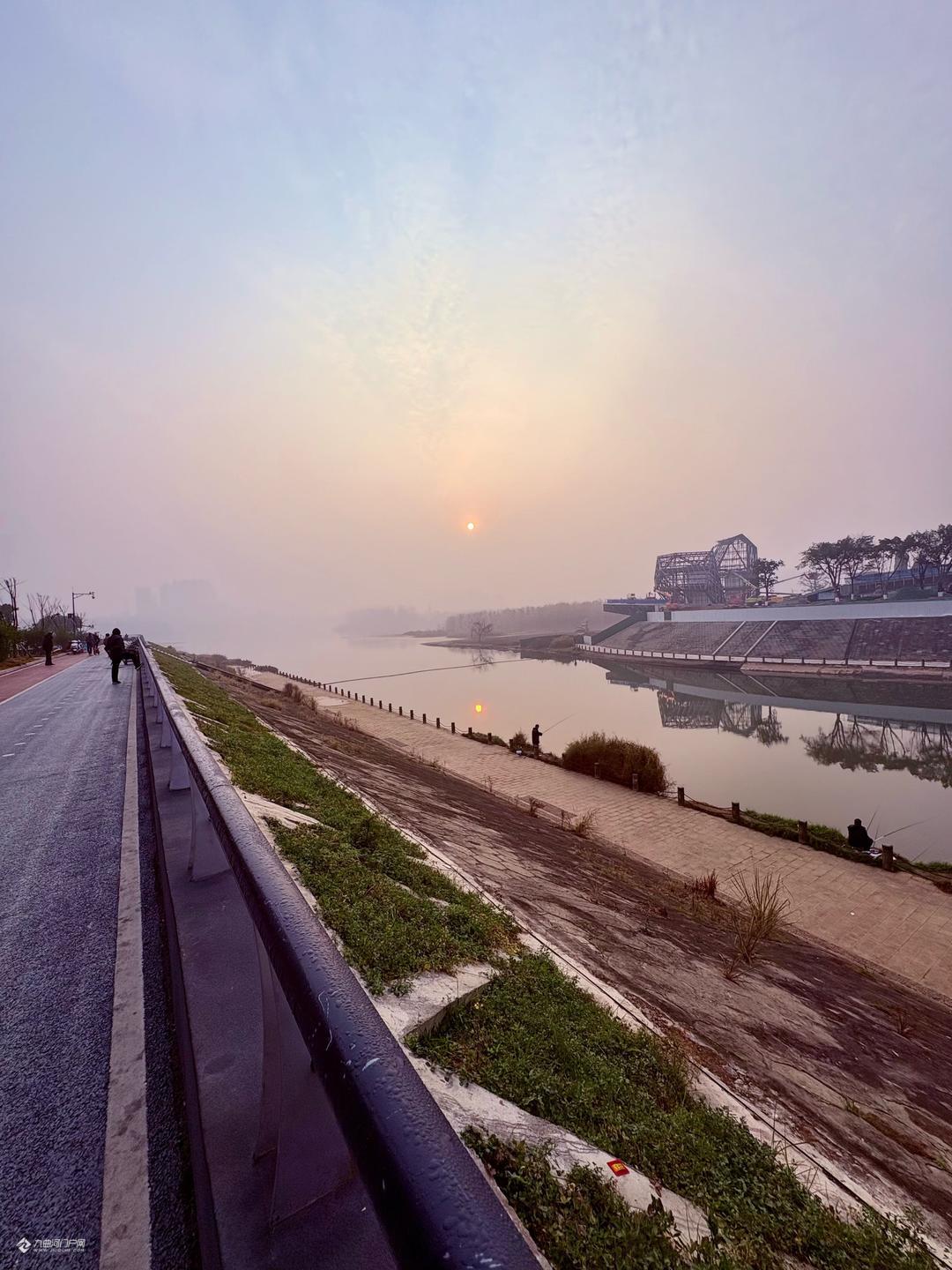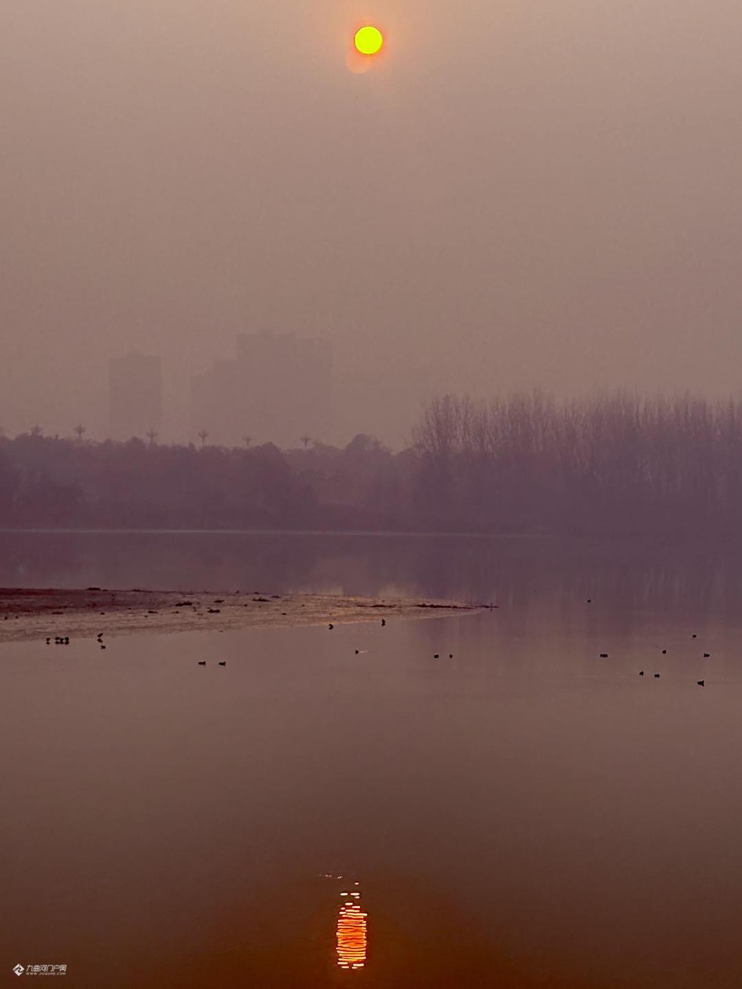 晨曦初照雁城江面渐醒, 白鹭掠空一群水鸟戏波, 垂钓者静坐与自然对话。